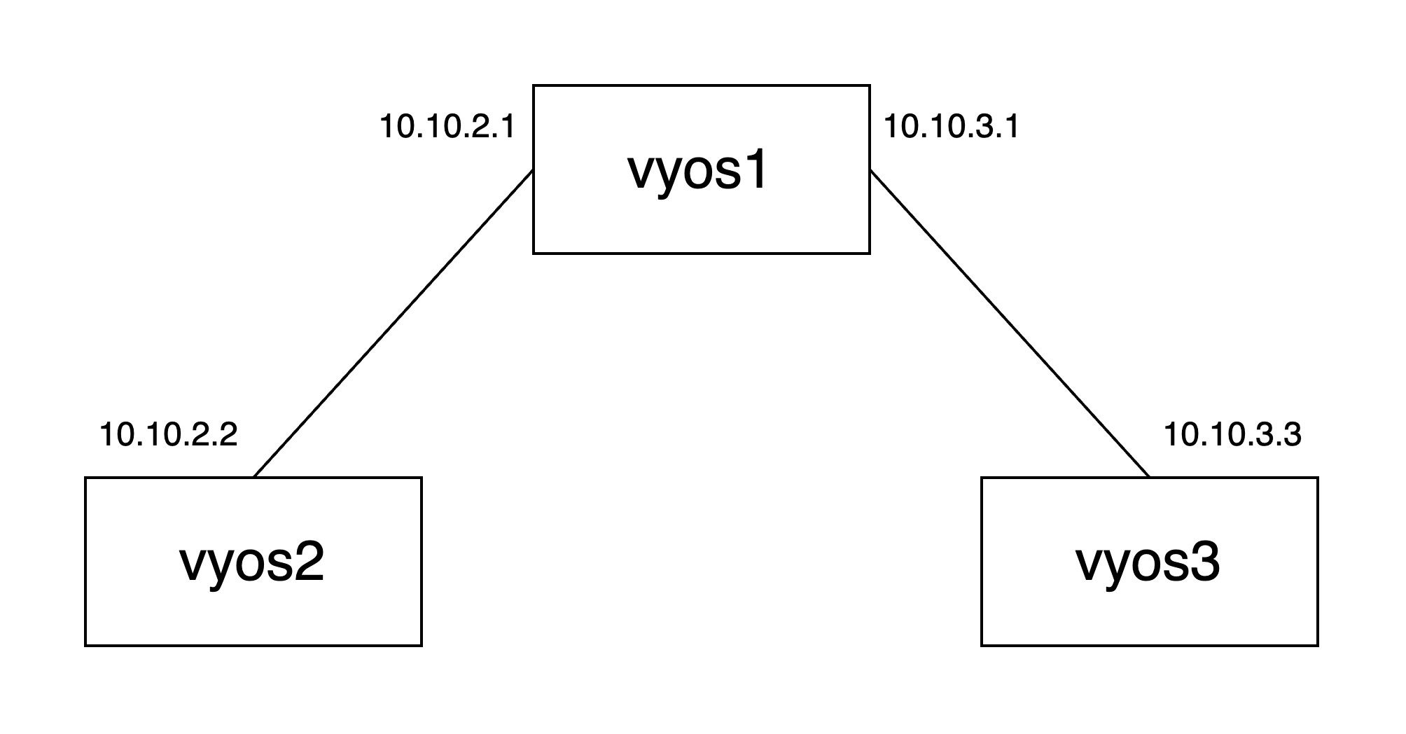 先輩に「図のようにVyOSを繋いで、このコンフィグを入れれば、vyos2とvyos3がvyos1を経由して通信できるよ」と言われコンフィグを渡されました。
